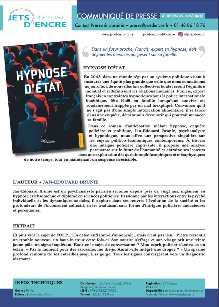 Dans ce roman d’anticipation captivant, Jan-Edouard Brunie, psychanalyste et expert en hypnose, explore les croisements fascinants entre hypnose, politique et enquête criminelle. À travers un récit riche en suspense et en réflexions philosophiques, il plonge ses lecteurs dans une vision percutante du futur, questionnant les limites de l’éthique, de la liberté et du pouvoir.